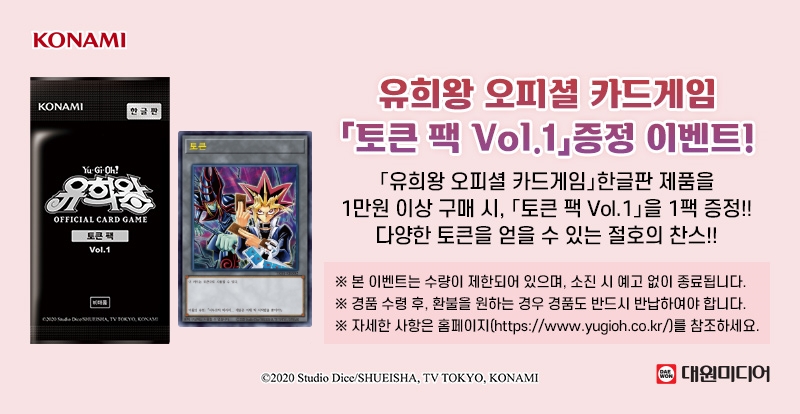 | 행사 일정 - 2022년 9월 30일 금요일 ~ 소진 시 까지 (각 판매점 도착 시점 이후부터) 행사 장소(전국 공인카드샵 및 온라인 판매처) - 자세한 리스트는 아래 링크를 참조하여 주세요. (http://www.yugioh.co.kr/site/event_store.php?code=store) ![]() 토큰 팩 Vol.1 ① 오프라인 공인카드샵 및 온라인 판매처에서 한글판 “유희왕 오피셜 카드게임” 제품 1만원 구매 시 마다 "토큰 팩 Vol.1"을 증정! ② 1인 당 개수 제한은 없습니다. ※ 잔여 수량은 각 업체에 문의 바랍니다. ※ 본 이벤트는 수량이 소진되는 대로 예고 없이 종료됩니다. ※ 온라인 업체는 아래 배너가 있어야 진행됩니다. 사전 문의 바랍니다. ![]() ※ 전 종에 레어 / 울트라 레어 카드가 존재합니다. |