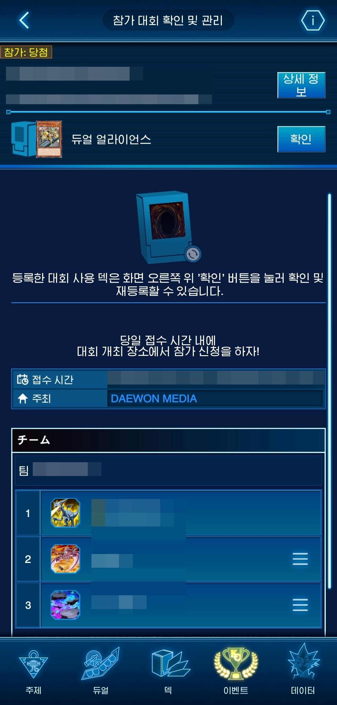 | STEP 1 : 팀을 구성하려는 유저를 팔로우 ① 하단의 "데이터" 탭에서 - "프로필" 항목 터치 ![]() ②상단의 "내 코드/사용자 검색"을 터치 ![]() ③화면에서 자신의 QR코드를 상대에게 보여주거나 아래 "스캔"버튼으로 다른 유저를 스캔합니다. ![]() ④상대 유저의 QR코드를 스캔한 경우 팔로우하기를 눌러 팔로우 합니다. ![]() STEP 2 : 팀을 구성하려는 유저를 팔로우 ① 하단의 "이벤트" 탭에서 - "기타" - "동반자 목록"으로 접속 ![]() ②상단의 "동반자 신규 등록"버튼을 눌러 동반자를 등록하고, 상대 유저는 동일한 화면에서 수락합니다. (수락할 경우 "등록된 동반자 목록"에 표시됩니다.) ![]() ③동반자 수락이 완료되었다면 참가하고자 하는 팀 대회에 들어가 하단의 "추가 및 변경"을 선택합니다. ![]() ④동반자를 등록하고 팀 이름을 정한 후 신청하고, 추첨결과를 기다립니다. ※ 대회 신청 전 단계에서 리더를 제외하고 팀원의 번호를 바꿀 수 있습니다. ※ 타인을 모욕, 미풍양속을 저해하거나 정치적인 내용이 담긴 팀명이라고 판단되는 경우 당일 참가가 거부되거나 경품을 수령할 수 없는 등의 불이익을 받을 수 있습니다. 이에 대한 책임은 해당 팀에 있습니다. ![]() STEP 3 : 참가추첨에 확인 및 당첨된 경우 덱 등록 ① 하단의 "이벤트" 탭에서 - "참가 대회 확인 및 관리"를 터치 ![]() ②본인이 참가 신청한 대회의 추첨결과를 확인합니다. ![]() ③유희왕 뉴런에 인증한 코나미 ID와 연동되는 유희왕 오피셜 카드게임 - 카드 데이터베이스(링크)에서 자신의 덱을 등록할 수 있습니다. ※ 대회시작 전 등록해야하며, 등록하지 않는 경우 참가할 수 없습니다. 반드시 미리 작성해주세요. ※ 대회시작 이후, 덱을 바꾸거나 수정할 수 없습니다. ![]() 2025.01.14 갱신 |